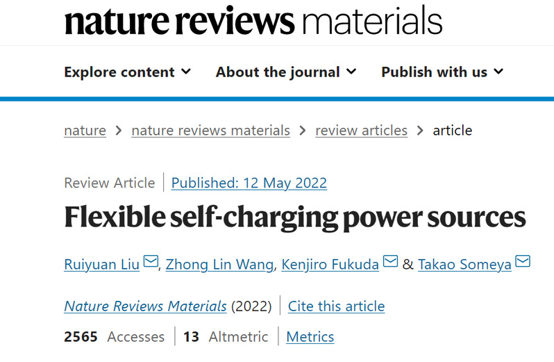 近日,苏州大学经典三级 刘瑞远教授、中科院北京纳米能源与系统研究所王中林院士、日本理化学研究所Kenjiro Fukuda、日本理化学研究所和东京大学Takao Someya教授在Nature Reviews Materials上发表题为“Flexible self-charging power sources”的综述论文。刘瑞远教授为论文的第一作者和共同通讯作者,Kenjiro Fukuda和Takao Someya教授为论文的共同通讯作者,论文第一单位为苏州大学经典三级 。