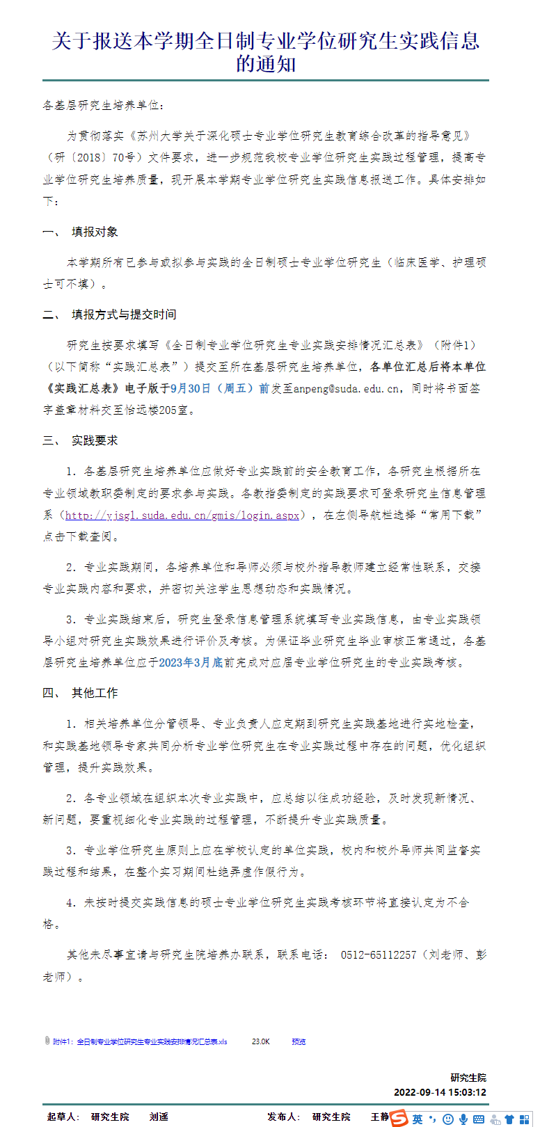 附2:苏州大学校内通知《关于报送本学期全日制专业学位研究生实践信息的通知》